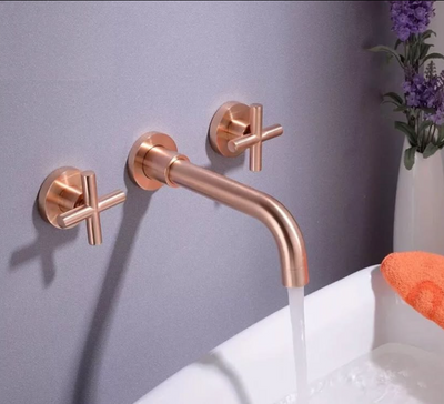 Copper Satin Wall Mounted Cross Handles Lavatory Faucet Set